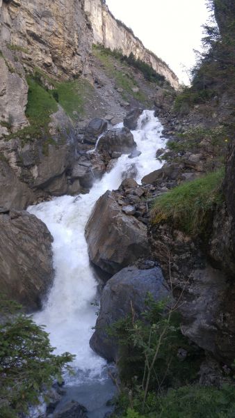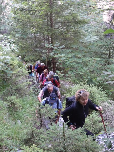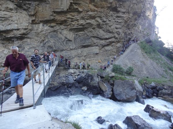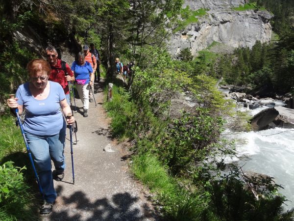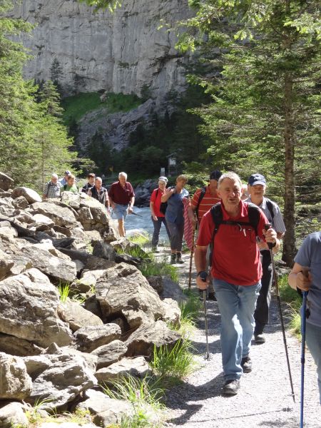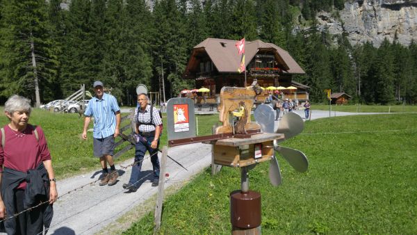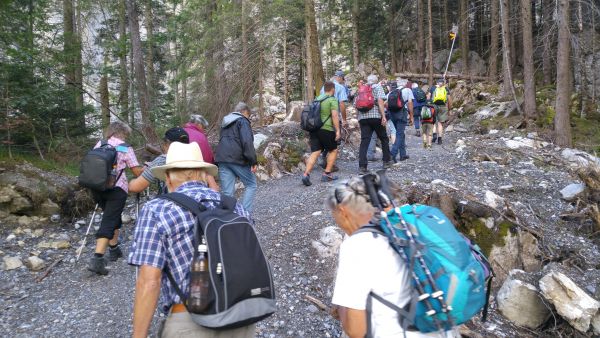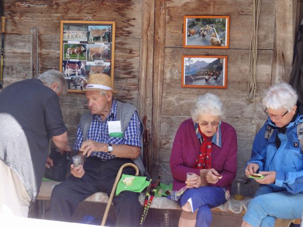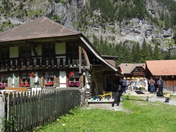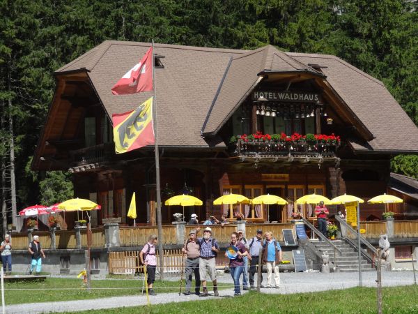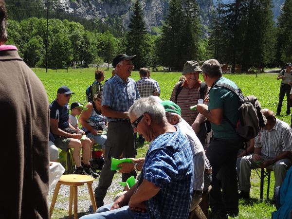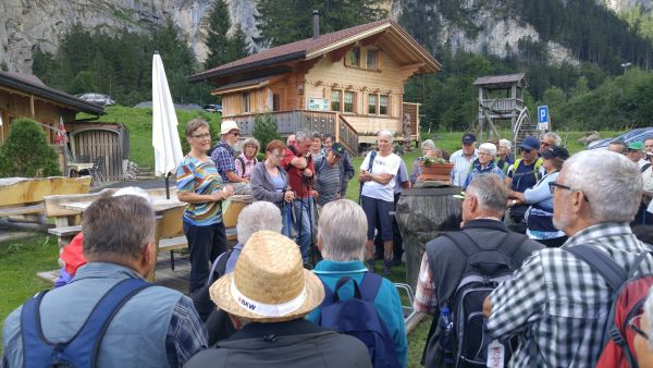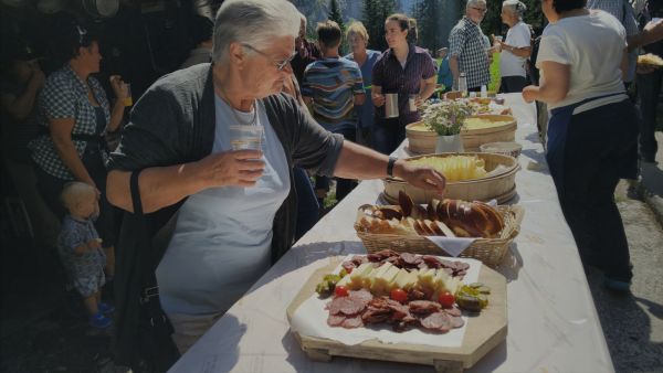 Nach einem strengen, aber eindrücklichen Aufstieg durch die Schlucht freuten sich die rund 80 Exkursionsteilnehmer auf ein schmackhaftes Apéro. Gastgeber Caroline und Hanspeter Ryter bewirteten die Gruppe mit Hobelkäse und Wurst aus eigener Produktion. Die Alp Gasternholz wird seit 1936 durch die Familie Ryter bewirtschaftet. Rund 50 Stück reinrassige Simmentaler finden in den Ställen neben dem Hotel Waldhaus Platz.